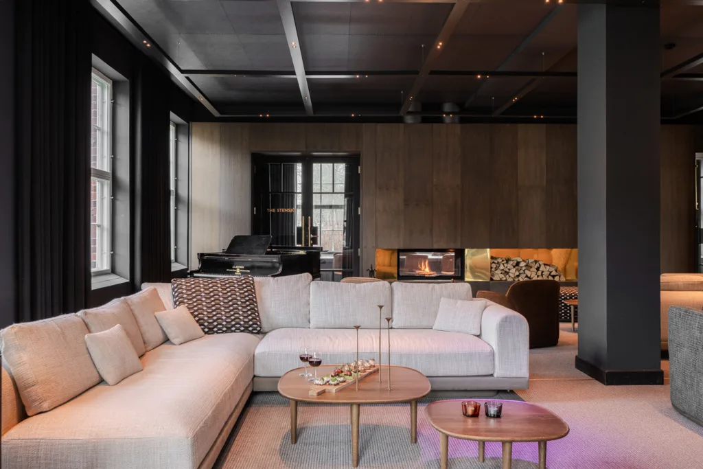 At the centre of the hotel is a warm lounge and wine bar, a relaxed social space where guests can unwind by the fire, enjoy local drinks or settle in with a book. Art and craftsmanship are woven throughout, with works by local artists and furniture created by Finnish makers adding depth and authenticity to the experience.
