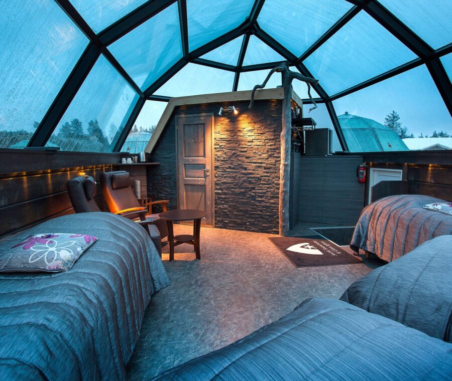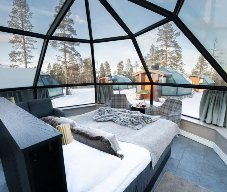 Glass-walled igloos under the northern lights in LaplandPanorama Glass Lodge